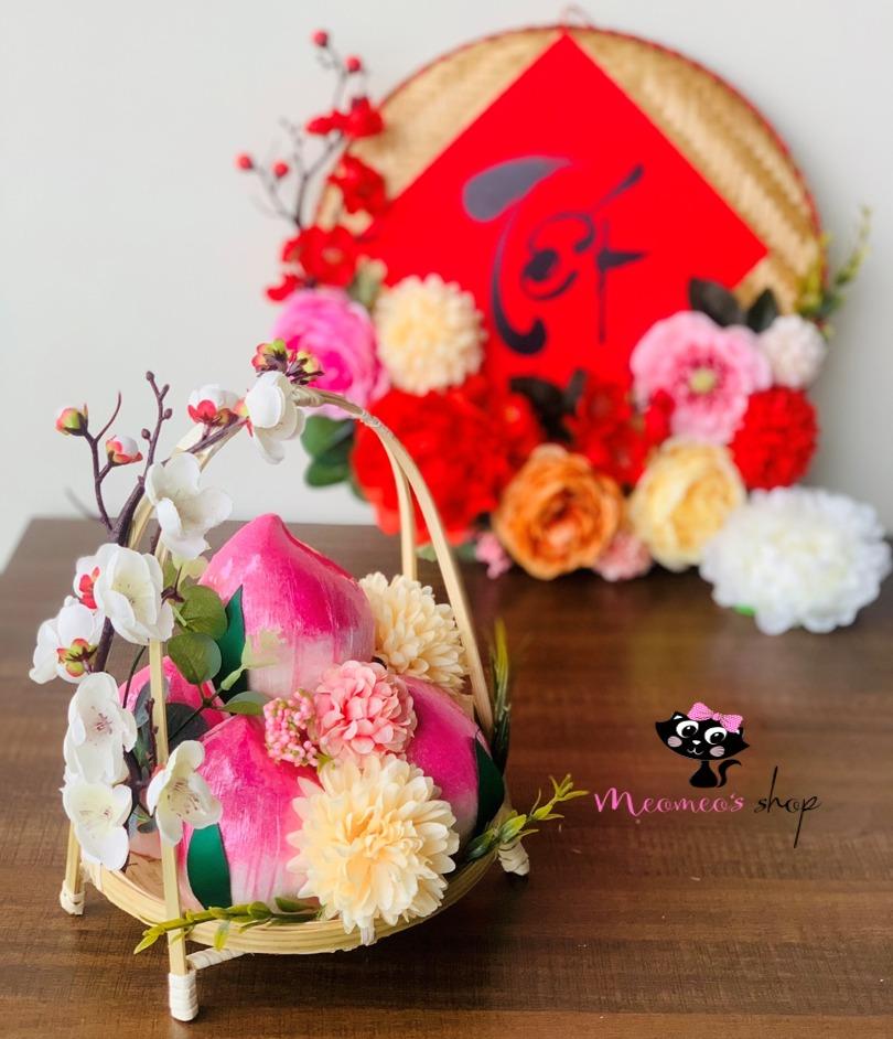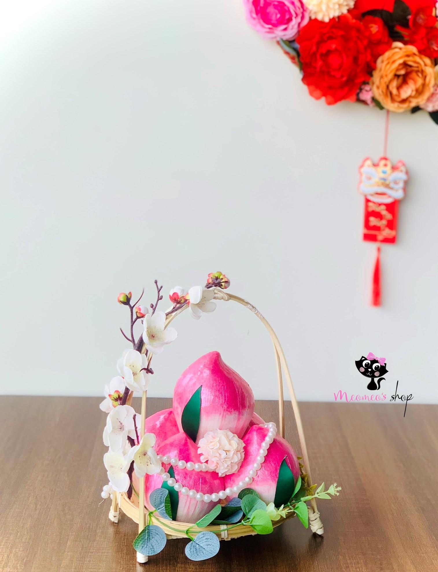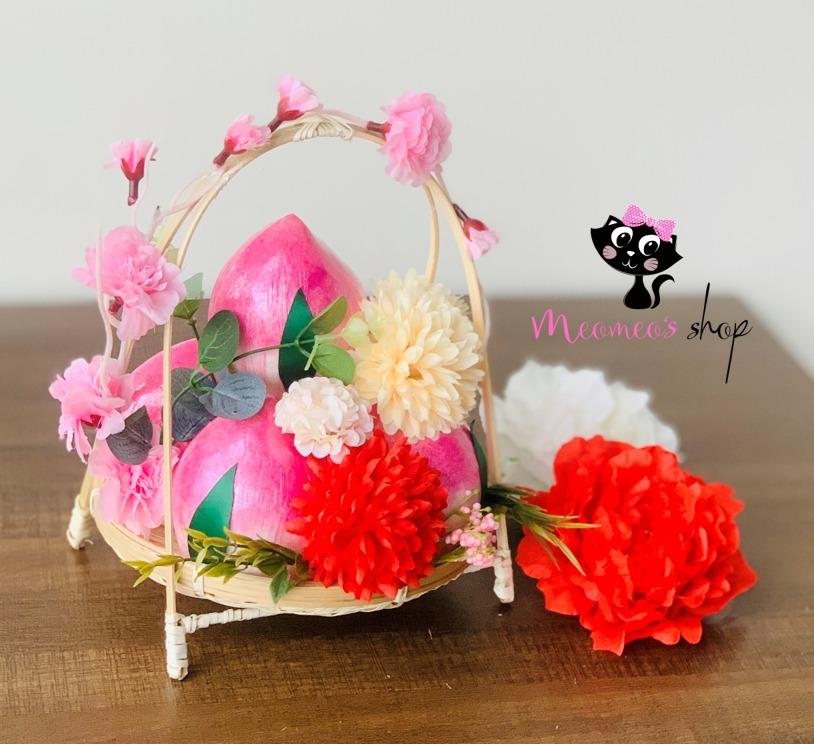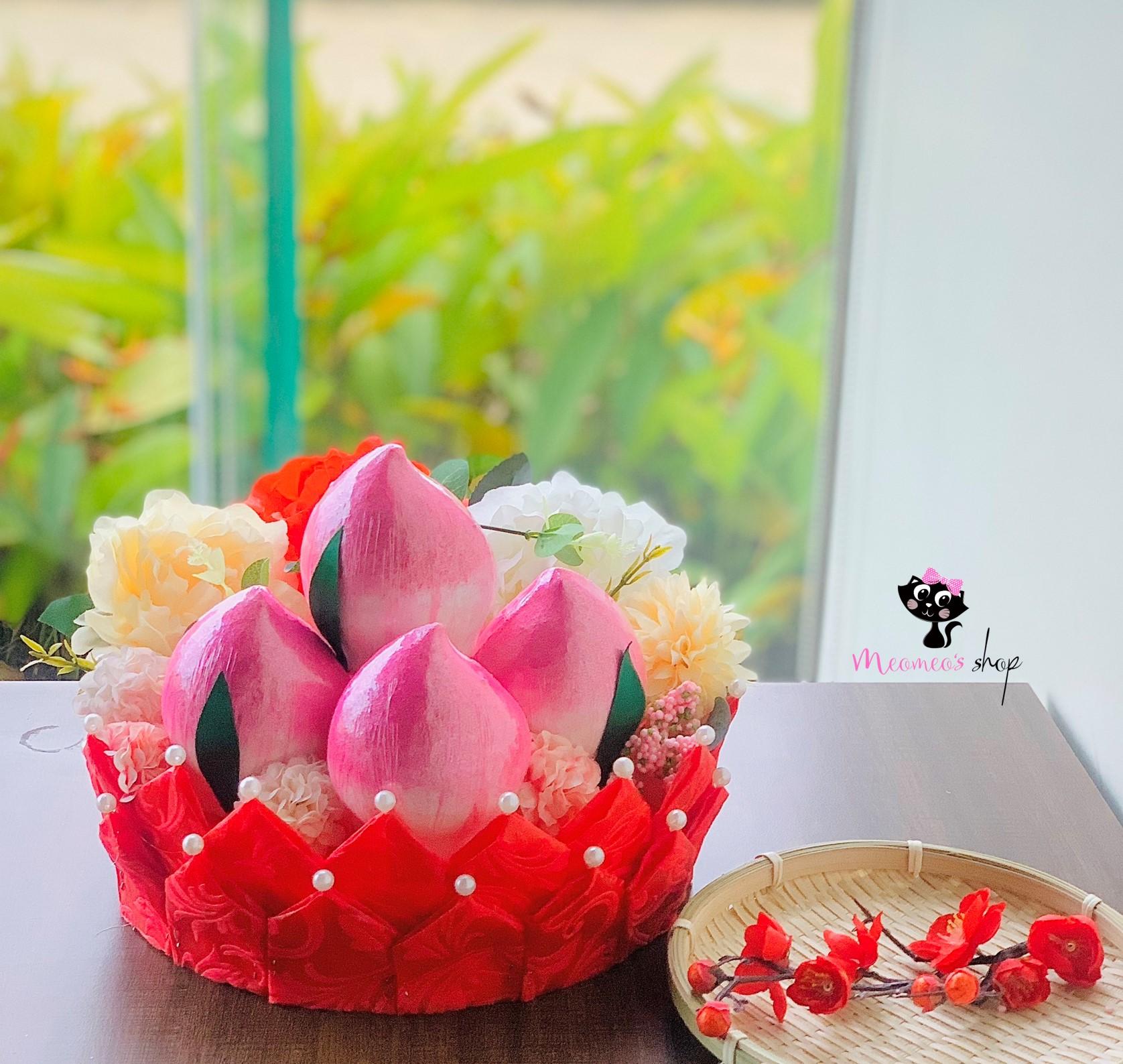 Tháp(hoặc giỏ) oản đào tiên có 2 size 350g/quả và 200g/quả, có các set 1 quả - 3 quả - 5 quả - 9 quả